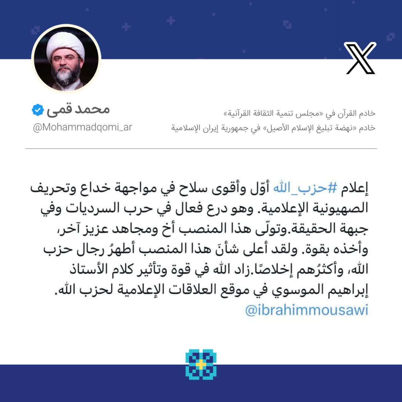 به گزارش روابط عمومی سازمان تبلیغات اسلامی، حجتالاسلام محمد قمی، رئیس سازمان تبلیغات اسلامی به مناسبت انتصاب ابراهیم موسوی به مسئولیت ارتباطات رسانهای حزبالله سرافراز، در صفحه شخصی خود در شبکه اجتماعی ایکس ویژه مخاطبان عرب زبان نوشت؛