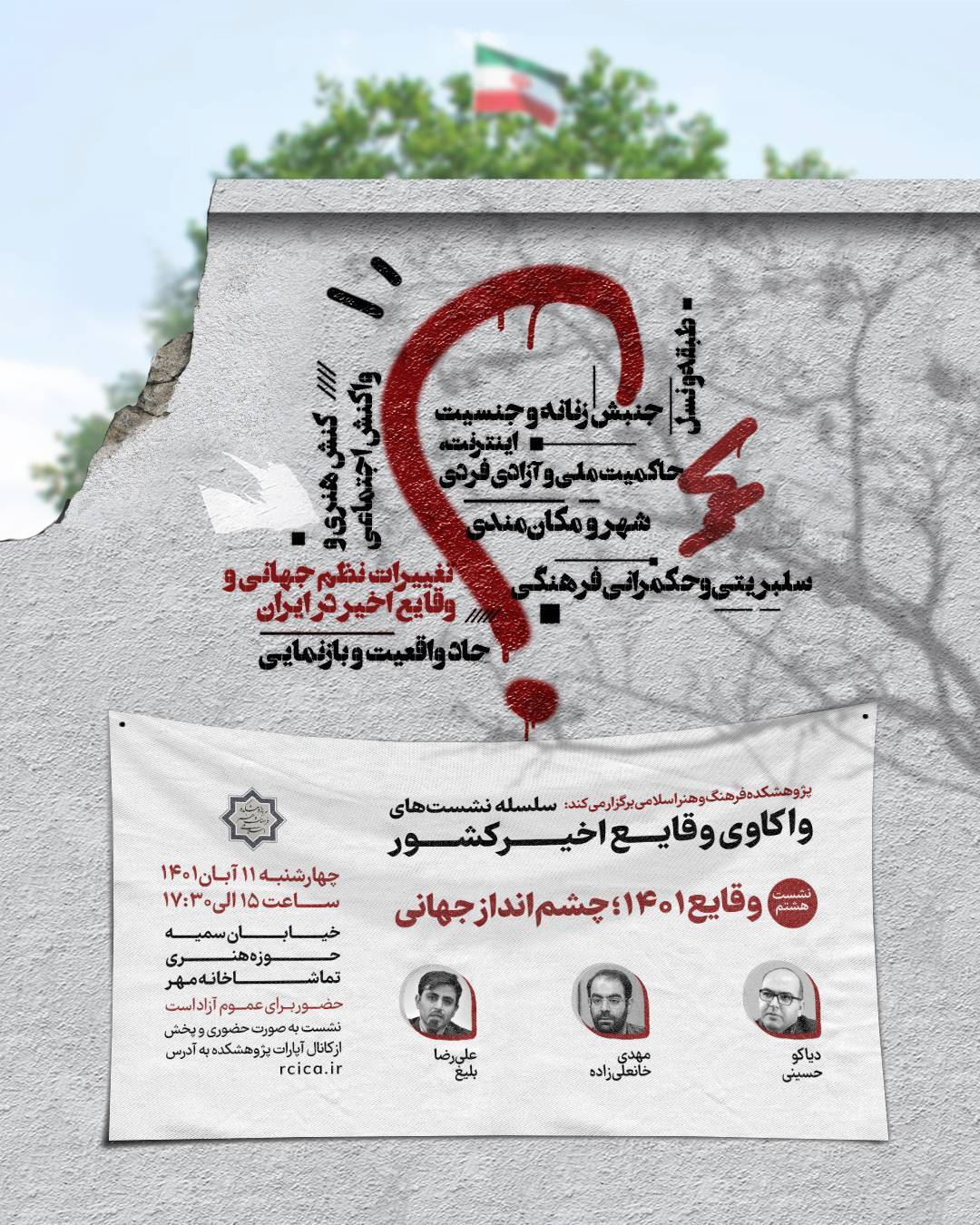 نشست هشتم از سلسله نشست‌های «واکاوی وقایع اخیر» با موضوع «وقایع ۱۴۰۱؛ چشم‌انداز جهانی» به همت پژوهشکده فرهنگ و هنر اسلامی، چهارشنبه ۱۱ آبان‌ماه در تماشاخانه مهر واقع در حوزه هنری برگزار می‌شود.