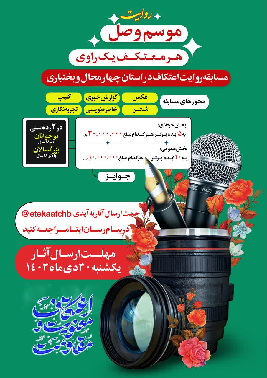 همزمان با ایام البیض و آغاز مراسم معنوی اعتکاف مسابقه روایت اعتکاف در استان چهارمحال و بختیاری با عنوان «روایت موسم وصل» برگزار میشود.