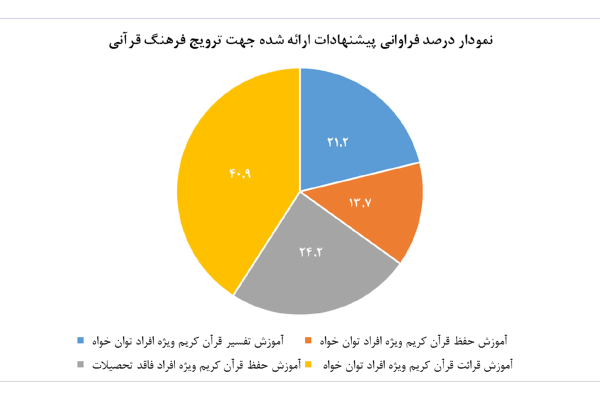 پیرو نظرات کاربران و مخاطبین خدمات قرآنی، بیشترین اقبال کاربران نسبت به پیشنهادات ارائه شده در حوزه ترویج فرهنگ قرآنی، آموزش قرائت قرآن ویژه افراد توانخواه بوده است که در این راستا نیازمند بکارگیری ابزارهای نوین آموزش در بستر آموزشهای مجازی خواهیم بود. همچنین با در نظر گرفتن نظرات در حوزه بهبود ارائه خدمات قرآنی، بیشترین تقاضای مخاطبین نسبت به افزایش تنوع بازههای زمانی آموزش قرآن کریم بوده است که نیازمند افزایش ظرفیت آموزش مجازی به عنوان یک الزام میباشد.
