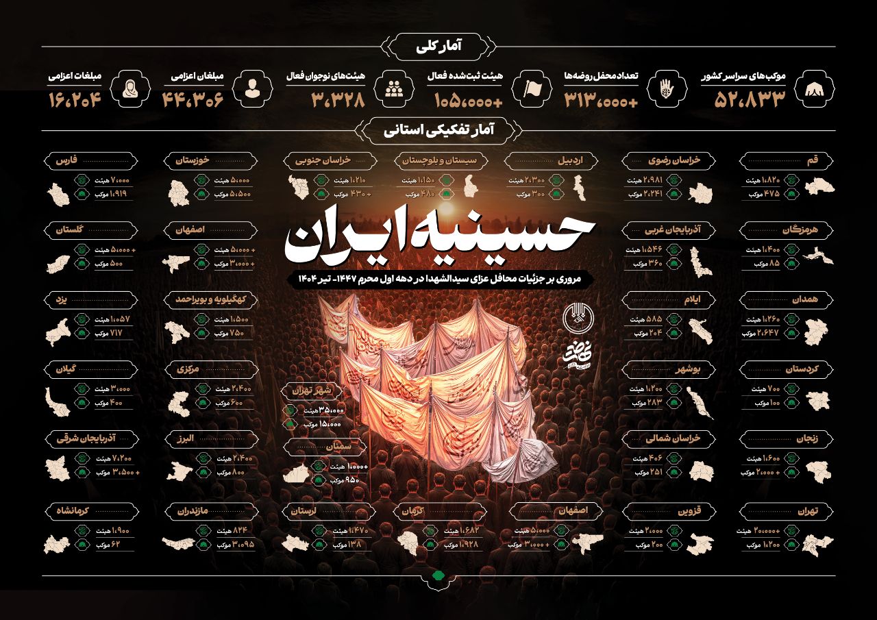 به گواه این آمارها بیش از ۳۱۳ هزار محفل عزای حسینی (از قبیل روضههای خانگی و هیئات ثبتنشده) در کنار ۱۰۵ هزار هیئت ثبت شده فعال در شبهای دهه محرم، عزای حسینی را اقامه کردهاند و بیش از ۵۲ هزار موکب نیز در جایجای ایران برپا شد. بیش از ۳ هزار و ۳۰۰ هیأت نوجوانانه هم در این شبها فعالیت داشتند.