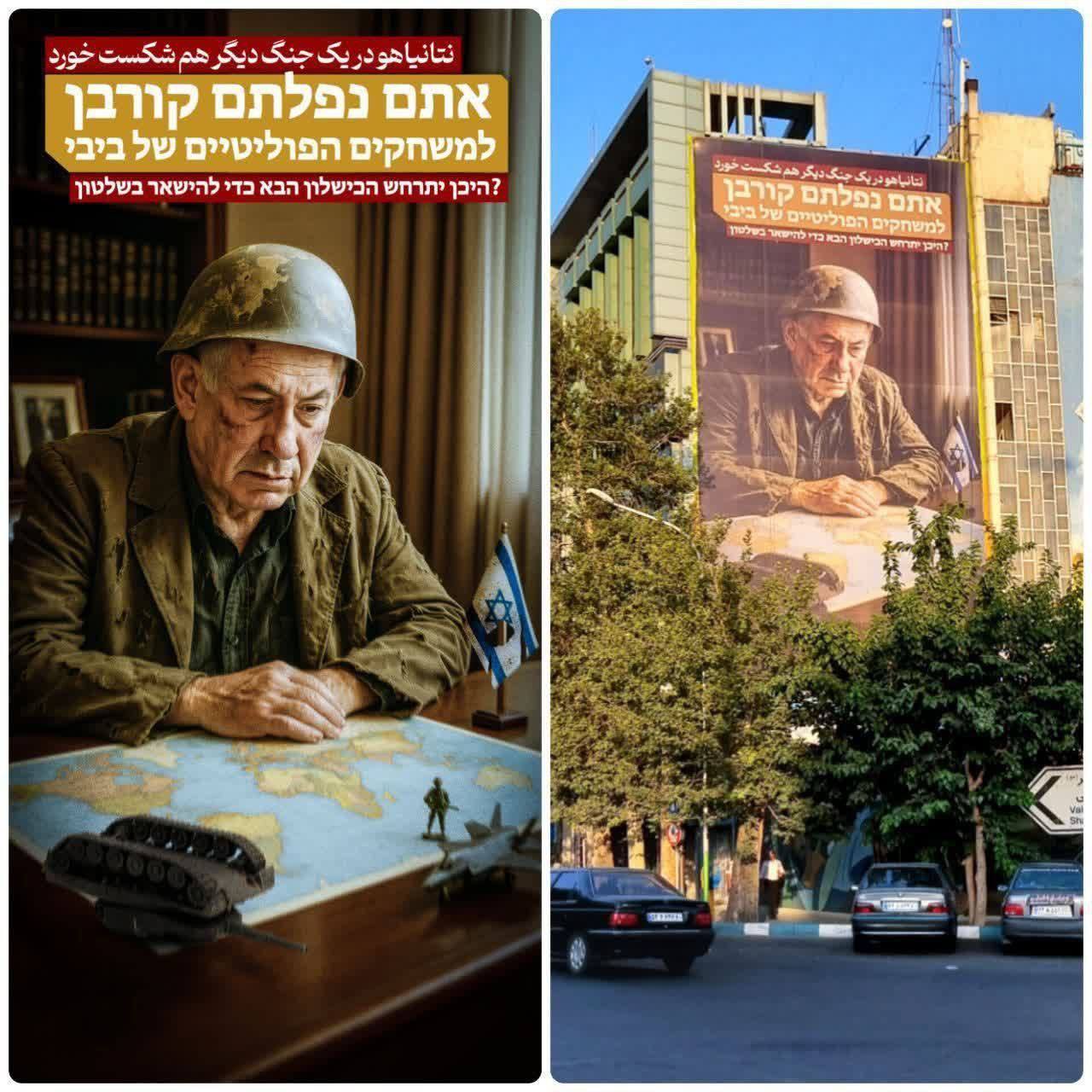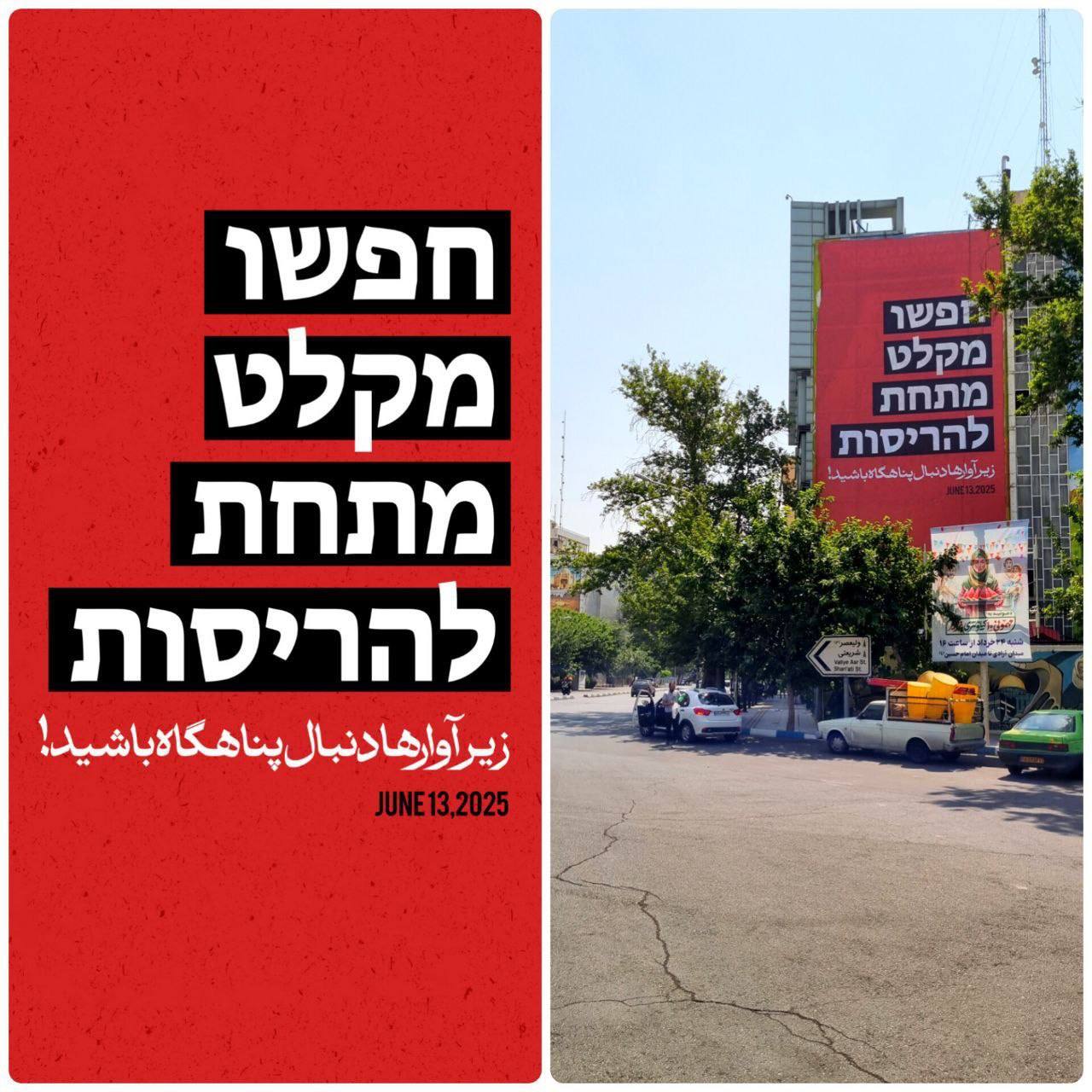 پس از جنایت سحرگاه روز 23 خردادماه رژیم صهیونیستی علیه کشورمان، دیوارنگاره میدان فلسطین تهران با پیامی به به زبان عبری رونمایی شد؛ «زیر آوارها دنبال پناهگاه باشید!»