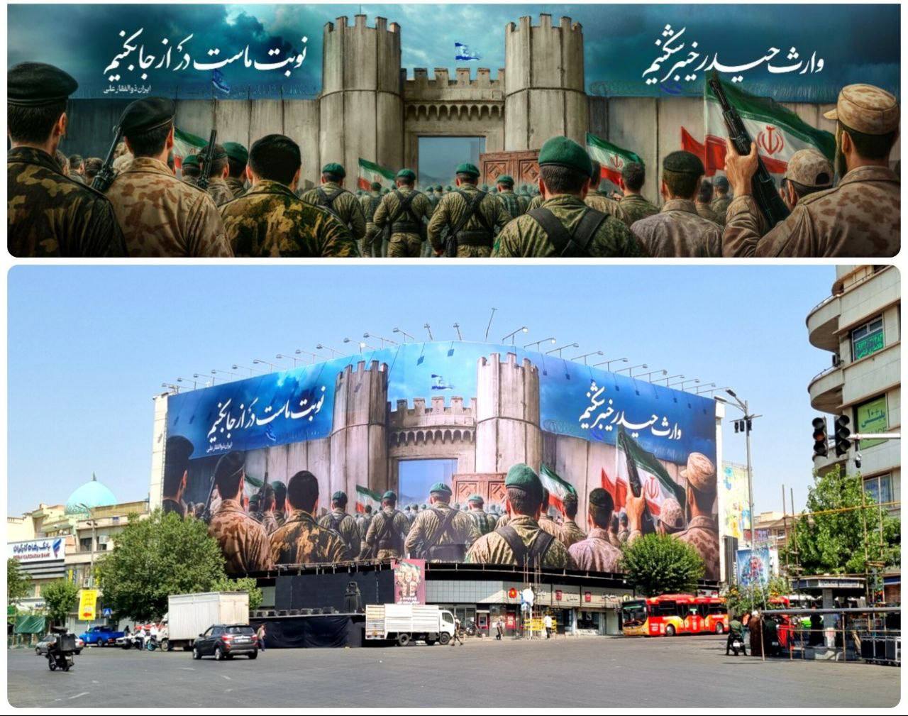 در آستانه برپایی تجمع بزرگ مردمی علیه رژیم صهیونیستی در روز عید غدیر، دیوارنگاره میدان انقلاب تهران با شعار «ایران، ذوالفقار علی(ع)» رونمایی شد. این دیوارنگاره با محوریت یادآوری فتح خیبر و بیت «وارث حیدر خیبرشکنیم / نوبت ماست که در از جا بکنیم» به نمایش درآمد.