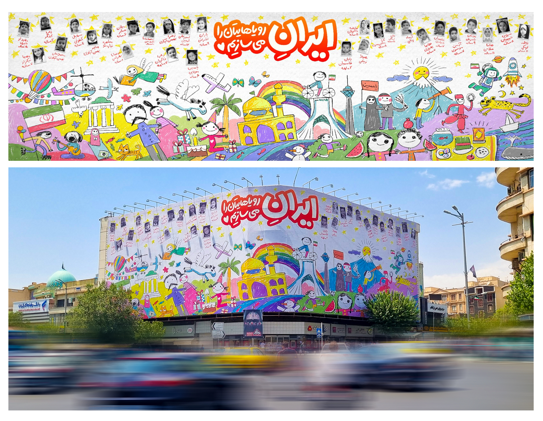 نقاشیهای کودکانه همراه با تصویر 28 شهید خردسال ایرانی که رژیم کودککش صهیونیستی در مدت جنگ تحمیلی خود علیه ایران اسلامی، آنها را به خاک و خون کشید، موضوع دیوارنگاره میدان انقلاب تهران شد. بر این دیوارنگاره، جمله «ایران رویاهایتان را میسازیم» درج شد.